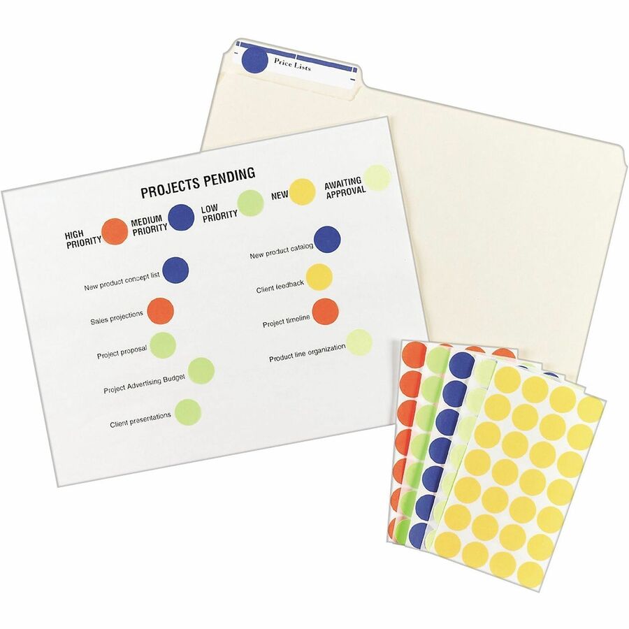 | Marketing Information | Make your labeling system come alive with dazzling color. Color-coding labels are ideal for document/inventory control, routing, organizing, highlighting, price marking, scheduling and more. The 3/4" round labels stick firmly to documents, inventory, sale items and more to draw the eye and help keep your important objects well-sorted. Handwrite your notes or use the free templates available online to customize the labels and conveniently print them on your laser or inkjet printer. The adhesive sticks firmly, but allows easy removal when no longer needed. Labels come on a 4" x 6" sheet size. They are not recommended for use with color laser printers. |