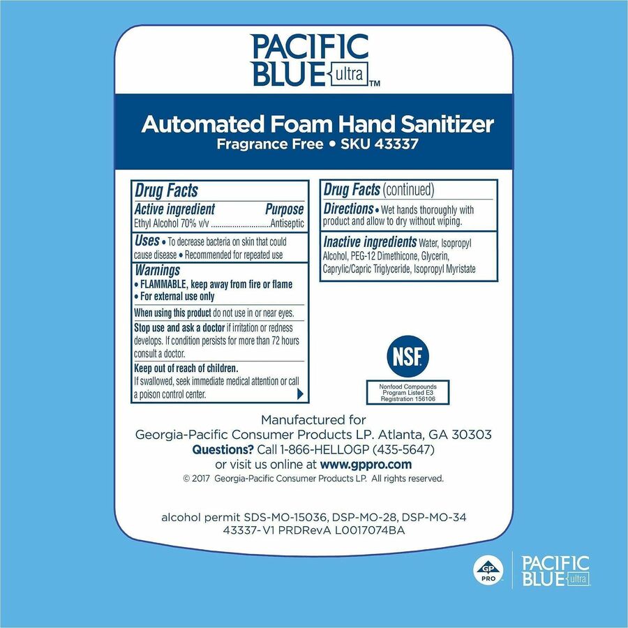 | Marketing Information | Part of the GP PRO Pacific Blue Ultra family, this fragrance-free, dye-free, foaming hand sanitizer kills even the toughest germs on contact, including 99.99 percent of common germs that may cause illness. This sanitizer has added moisturizers so it won't dry skin and is gentle enough for frequent use. Use this foaming hand sanitizer with any automated Pacific Blue Ultra soap/sanitizer dispenser (sold separately) in restrooms, classrooms, doctors' offices, grocery stores, food-prep areas or any workstation where good hand hygiene is essential. This E3-rated sanitizer is so strong and effective that it's approved for use in food-processing and foodservice areas after proper handwashing. This foaming hand sanitizer's high-capacity refills and adjustable portion control help reduce waste. |