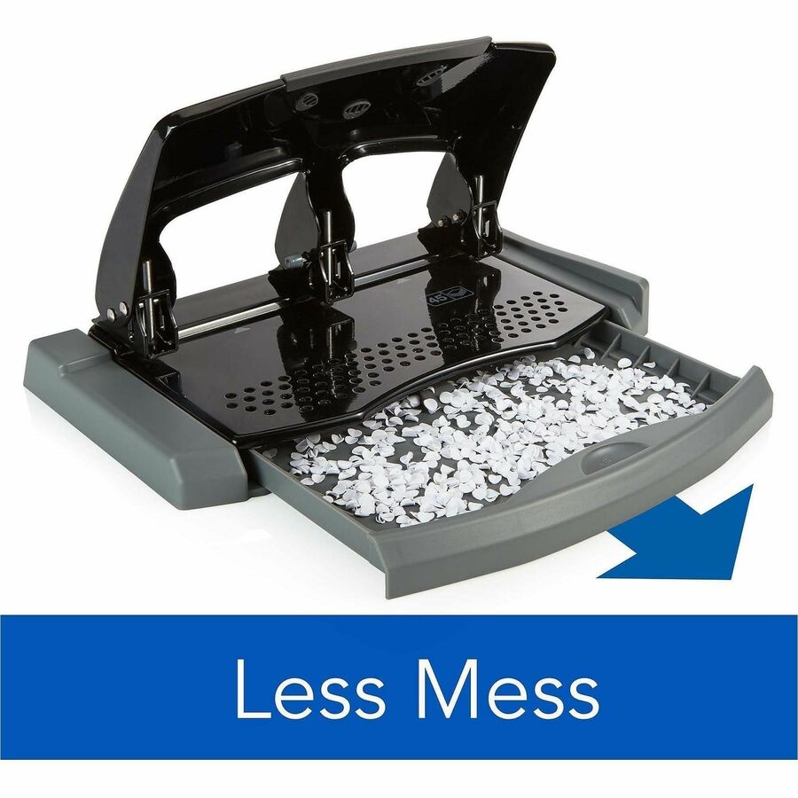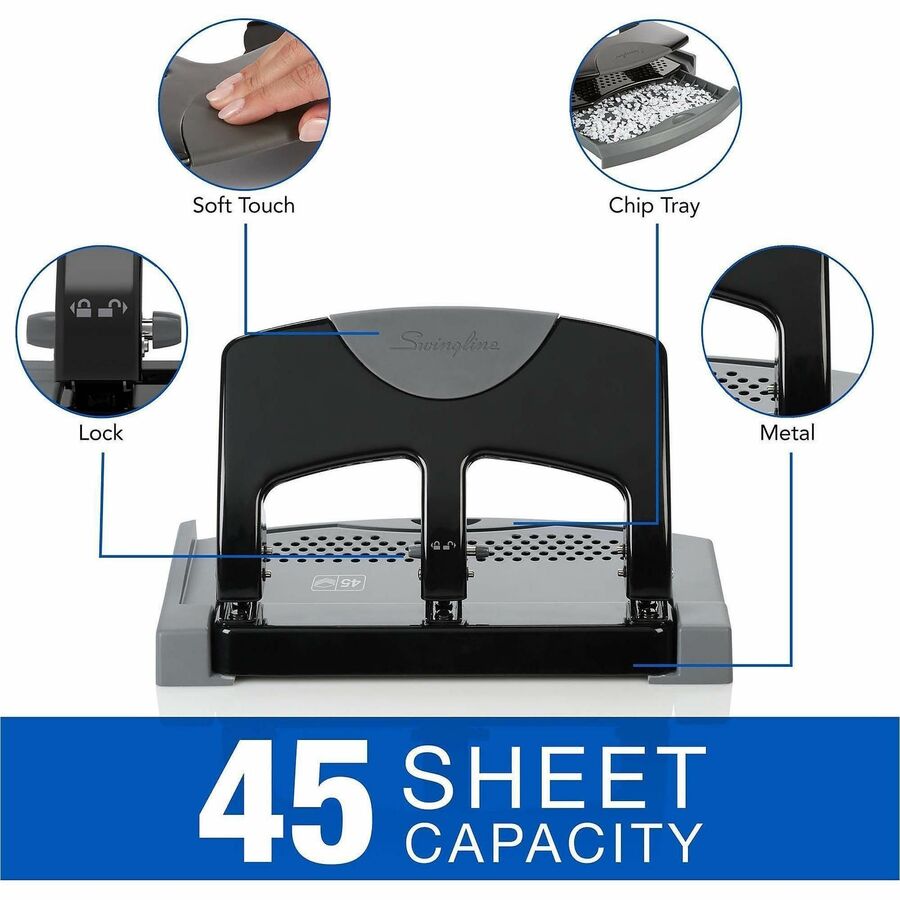 | Marketing Information | Easily punch through as many as 45 sheets with this SmartTouch manual three-hole punch. Compared to a standard paper punch, the SmartTouch requires 50 percent less effort. That means punching is twice as easy. Durable metal construction delivers long-lasting performance. The soft-grip handle locks down for a compact storage option when not in use. The 45-sheet SmartTouch punch offers a hole pattern in the punch base to provide visibility into the chip tray that lets you see when it's full. Pullout tray design makes the punch easier to empty. Built-in ruler and paper edge guide deliver perfectly aligned punching of 9/32" holes. Exact spacing ensures that your hole-punched sheets will match up for use with three-ring binders, three-prong folders and report covers. |