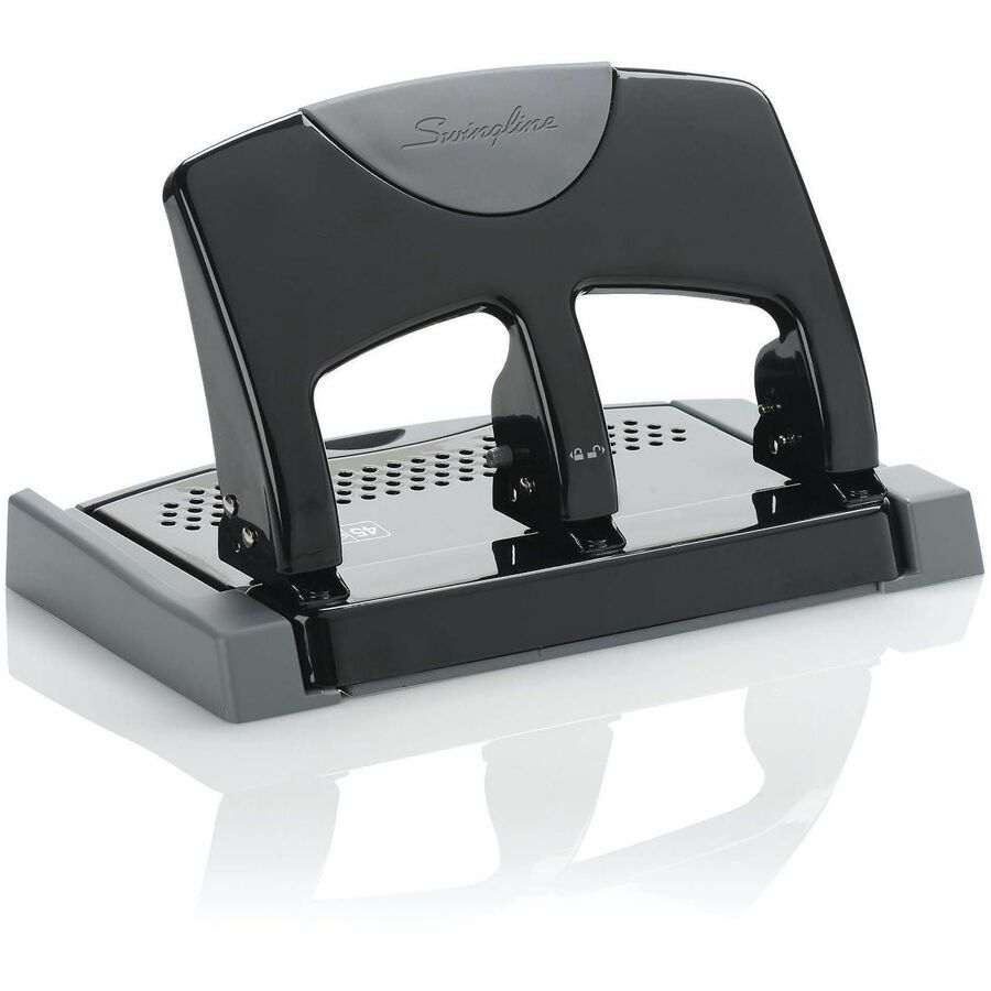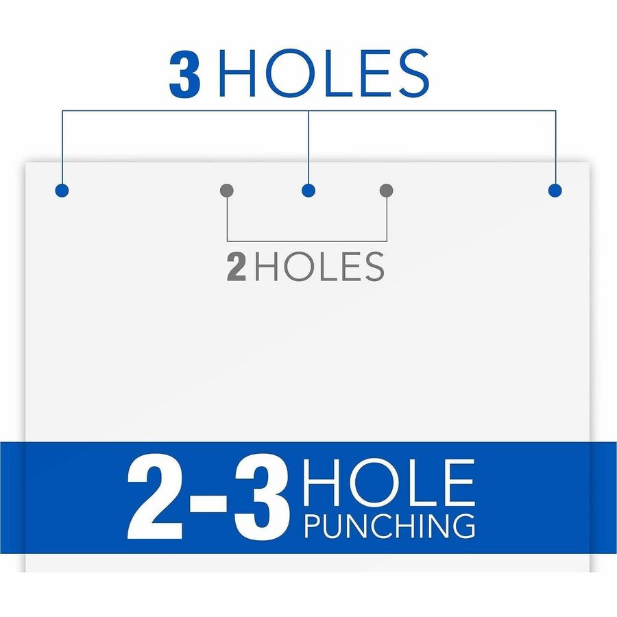 - Punches up to 45 sheets at once; fixed punch heads punch three 9/32" holes
