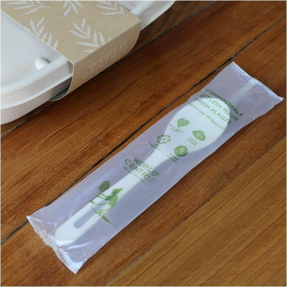 World Centric compstable 6in wrapped spoons are made from PLA polymer made from plants and Talc mineral filler. These utensils are certified compstable in a commercial facility, which may not exist in your area. The utensils may be washed in a dishwasher for reuse. The wrapper is also made from PLA and is compstable. |